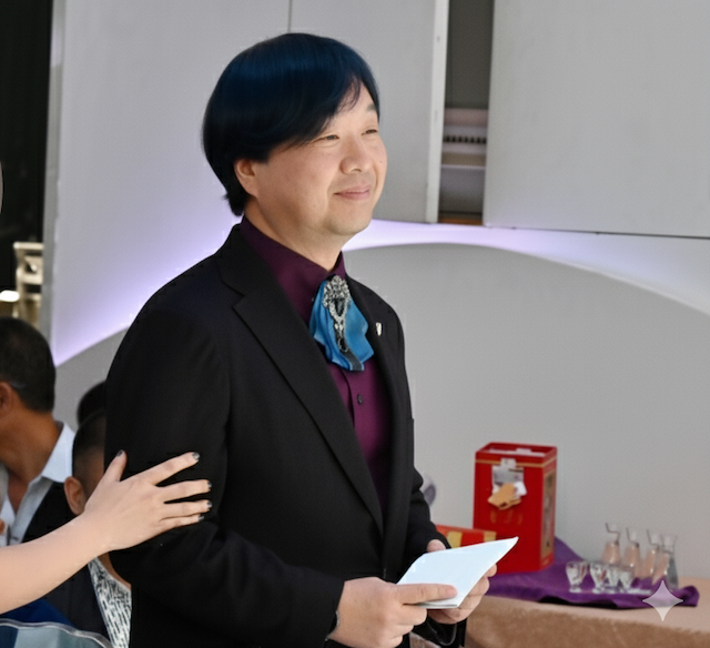 私のスピーチは通訳付きです。最初は新婦に通訳をしてもらうという案も出ましたが、新婦の通訳の同僚でもあり、私と新婦の共通の友人でもある女性に通訳をお願いしました。下の写真で手を添えてくれています。元写真ではちゃんと写っていますが顔出し不可なのが残念。
