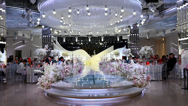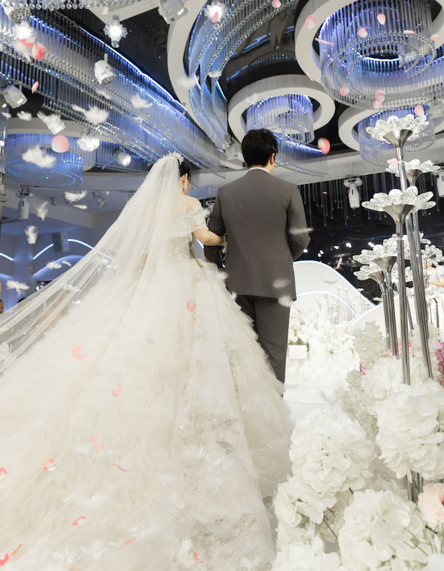 披露宴会場で結婚式が行われます。結婚式の進行と内容はキリスト教式を模していますが、「神」という言葉は一切出てきません。そして、式を司るのは司会者であり、宗教家ではありません。中国の都会においては大半の人が無宗教です。